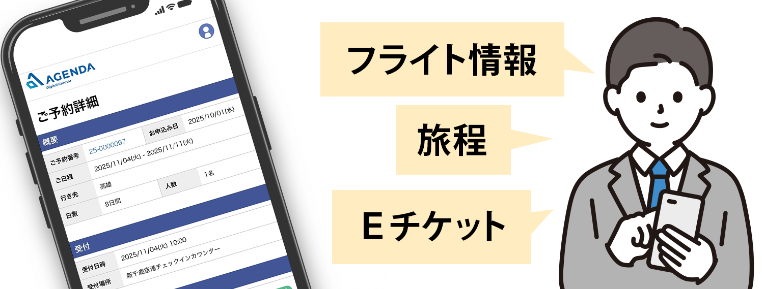 『タビマド』を導入することで、旅行者・出張者はパソコンやスマートフォンからいつでも最新の旅程や必要書類を確認可能に。フライト変更などの急な情報もリアルタイムで把握できるため、安心して旅行や業務に集中いただけます。さらに、パスポート番号など渡航に必要な情報もオンラインで登録でき、出発前の準備負担を大幅に軽減します。一方、旅行会社にとっては、問い合わせ対応の削減による業務負担の軽減に加え、手作業や伝達ミスを防ぐことで案内精度が向上。結果として、効率性と品質の両面からサービスを強化し、満足度向上に貢献します。